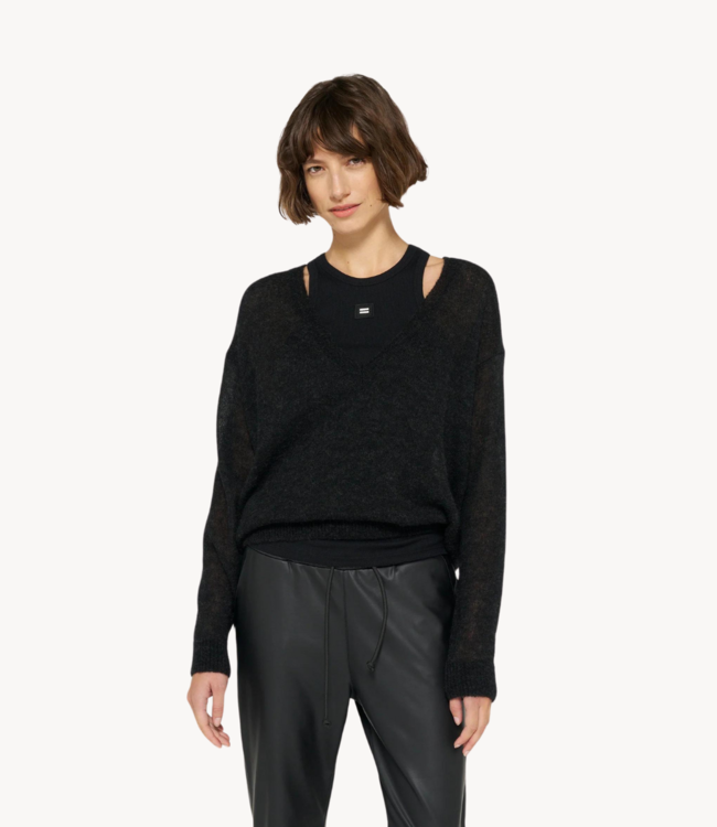 Zwarte trui van het merk 10DAYS. De trui heeft een mooie V-hals, lange mouwen en is gemaakt van een heerlijk zachte wollenblend. De trui heeft een relaxed fit en is voorzien van ribgebreide boorden.