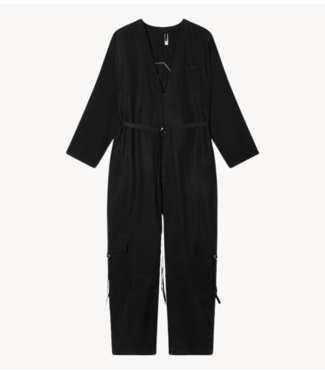 Zwarte jumpsuit van 10DAYS met een V-hals, ceintuur in de taille en een geborduurd ‘10’ logo op de rug.
