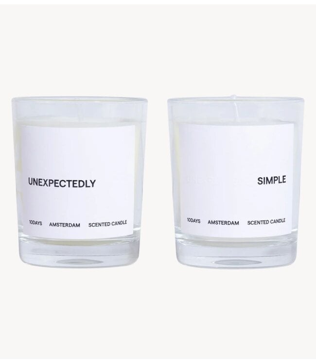 UNEXPECTEDLY SIMPLE geurkaarsen set van 10DAYS. Een belichaming van de levendige geest van Amsterdam, "UNEXPECTEDLY" barst van dynamische energie en levendige onvoorspelbaarheid, terwijl "SIMPLE" een geur van moeiteloze elegantie en opzettelijke eenvoud uitstraalt. Embrace the Unexpected, Celebrate the Simple. 2x 75G - 2.65 oz.
