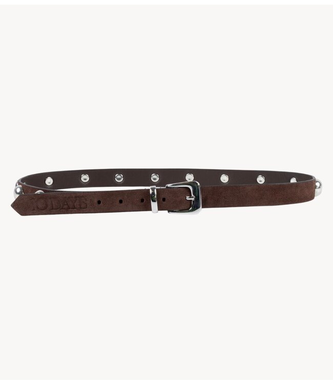 Diepbruine suède riem met studs voor een robuuste en modieuze uitstraling.