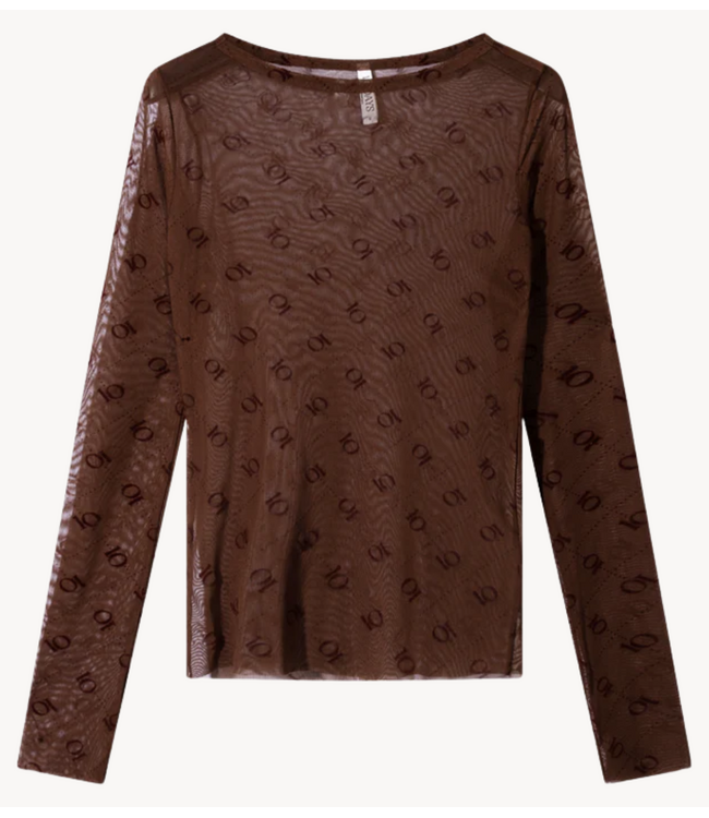 Aangesloten transparante longsleeve top, gemaakt van mesh voorzien van een 10 opdruk. Lange mouwen met duimsgaten en een raw edge zoom- en mouwafwerking.