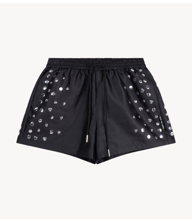 Zwarte short van Alix The Label met zilveren studs langs de zijkanten. Voorzien van een elastieken tailleband en trekkoord voor een comfortabele fit.