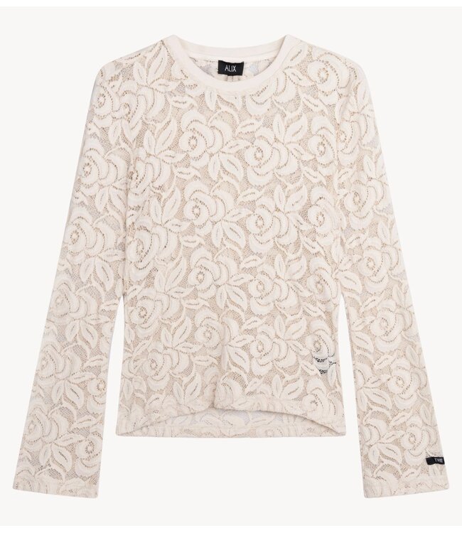 Crèmekleurige kanten top met fijne geweven details en vrouwelijke, elegante uitstraling.