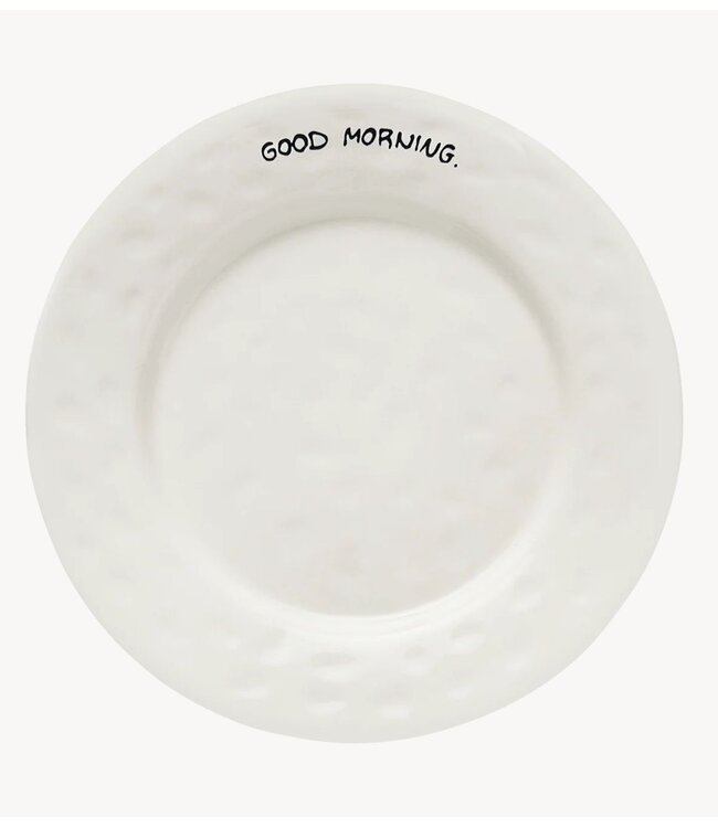 Crèmekleurige ontbijtbord van het merk Anna+nina. Het bord is handgeschilderd en is voorzien van de tekst 'Good Moring'.