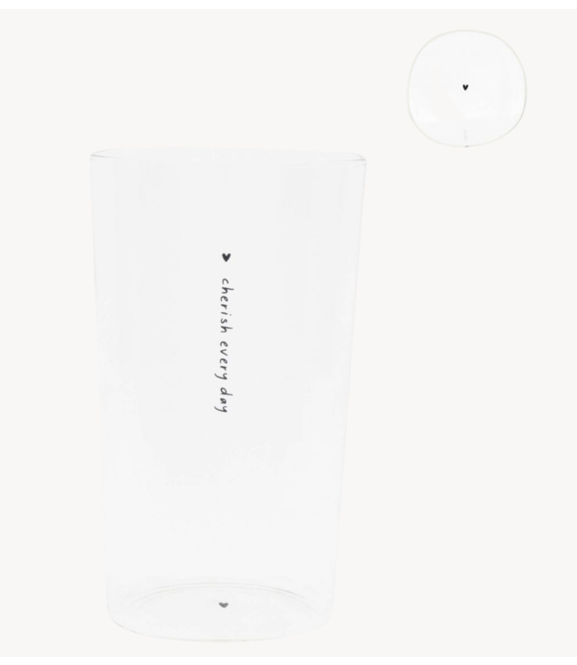 Waterglas van het merk Bastion met tekst 'cherish every day' en een hartje aan de onderkant.