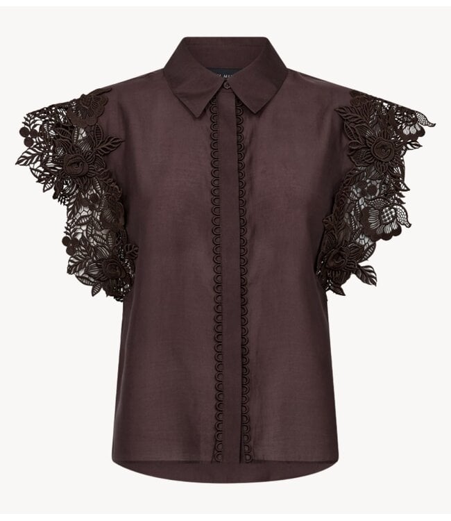 Het CMMOLLY-SHIRT is een overhemd van hoogwaardig materiaal met een verborgen knoopsluiting, geborduurde randen en een kraagplooi. Daarnaast heeft het overhemd korte mouwen met een geborduurd bloemenmotief voor een vrouwelijke uitstraling.