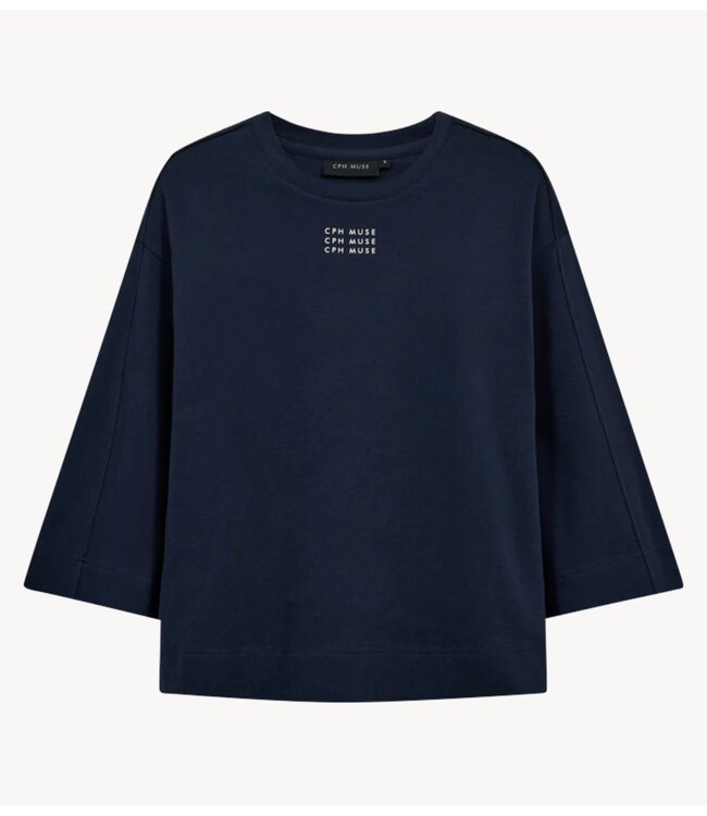 CMMUSE-TEE is een T-shirt van hoogwaardig, zwaar katoen. Het T-shirt heeft een kort model met ribboorden in de ronde halslijn, een logo-opdruk op de voor- en achterkant en korte mouwen met verlaagde schouders die het oversized silhouet benadrukken.