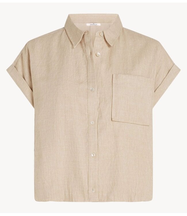 Luchtige linnen dames blouse uitgevoerd in een warme beige tint. De Kelly blouse heeft een loose fit, korte mouwen en een knoopsluiting aan de voorkant. Daarnaast heeft het een borstzak en een elastische band aan de onderkant. In meerdere kleuren verkrijgbaar.