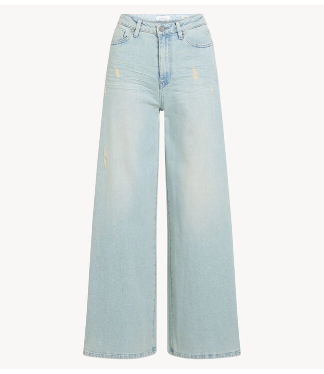 Vintage lichtblauwe wide fit jeans met wijde broekspijpen voor dames. De Harley denim heeft een high rise, 5-pocket design en heeft beschadigde details.