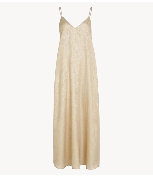 Lange zomerse damesjurk met verstelbare straps op de schouders. De Morgan dress is goudkleurig en heeft een loose fit met een v-hals.
