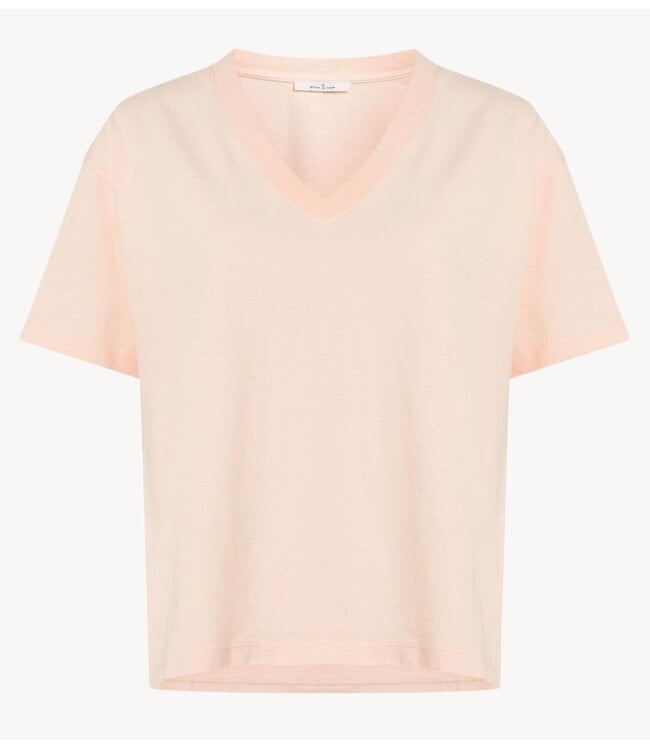 Luchtig katoenen dames t-shirt uitgevoerd in een lichte perzik tint. De Alexis tee heeft een loose fit met een v-hals. Beschikbaar in diverse tinten.