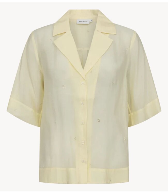 Botergele blouse van het merk Copenhagen Muse. Een overhemd met korte mouwen en knoopsluiting, gemaakt van een lichtgewicht, semi-transparante geweven stof. Het relaxte, rechtvallende model valt tot op de heup en heeft een klassieke camp-collar, gecombineerd met brede omgeslagen manchetten. Subtiele, tonale monogramborduursels zijn verspreid over het lijf en de mouwen, terwijl tonale stiksels de strakke lijnen van de kraag, sluiting en zoom accentueren.