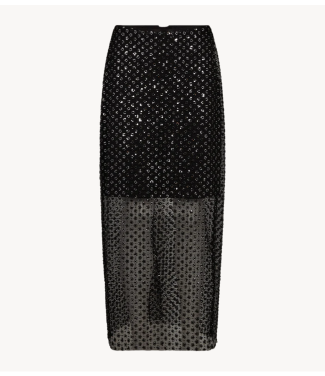 Rok van het merk Copenhagen Muse. De lange rok is van mesh en bevat pailletten en kraaltjes. De onderrok is kort en de achterkant is voorzien van een split.
