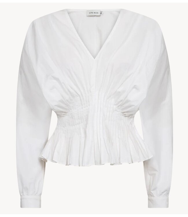 De CMPOPLIN-BLOUSE is gemaakt van stevig geweven katoenpoplin met een sculpturaal silhouet. De diepe V-hals wordt gecompenseerd door volumineuze, lange vleermuismouwen met manchetten met knoopjes. De volledig geplooide taille accentueert en definieert de vorm. Een geplooide peplumzoom zorgt voor beweging en een verfijnde, architectonische afwerking, compleet met een onzichtbare ritssluiting in de zijnaad.