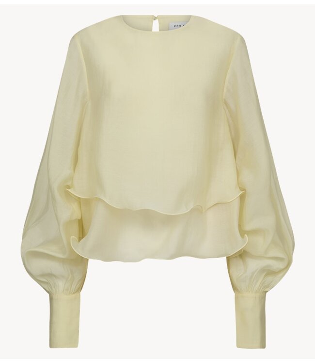 De CMTILLY-BLOUSE is een blouse met lange mouwen, gemaakt van een semi-transparante geweven stof met een soepele valling. Het model heeft een boxy silhouet en een extravagant gelaagd ruches-effect aan de zoom. De volumineuze, geplooide mouwen lopen taps toe in lange manchetten met met stof beklede knoopjes, en de minimalistische halslijn heeft een sleutelgatuitsparing aan de achterkant. Het lijfje is dubbel gelaagd, terwijl de mouwen ongevoerd zijn, wat een elegant contrast creëert met de transparantie.