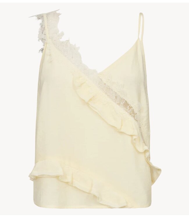 CMNORMA-TOP is een top van exclusieve kwaliteit met een V-hals, een verborgen ritssluiting aan de zijkant, smalle schouderbandjes en details van kant en ruches met onafgewerkte randen voor een verfijnde uitstraling.