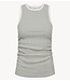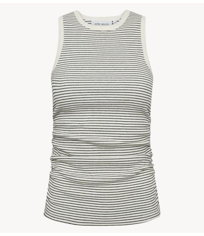CMSIV-TOP is een aansluitende tanktop gemaakt van biologisch katoenen ribjersey met stretch en geverfde strepen. Het silhouet is gevormd door een elastisch effect bij de zijnaden, waardoor een subtiele drapering rond de taille ontstaat. Effen ribboorden bij de halslijn en armsgaten maken de strakke, grafische look compleet.