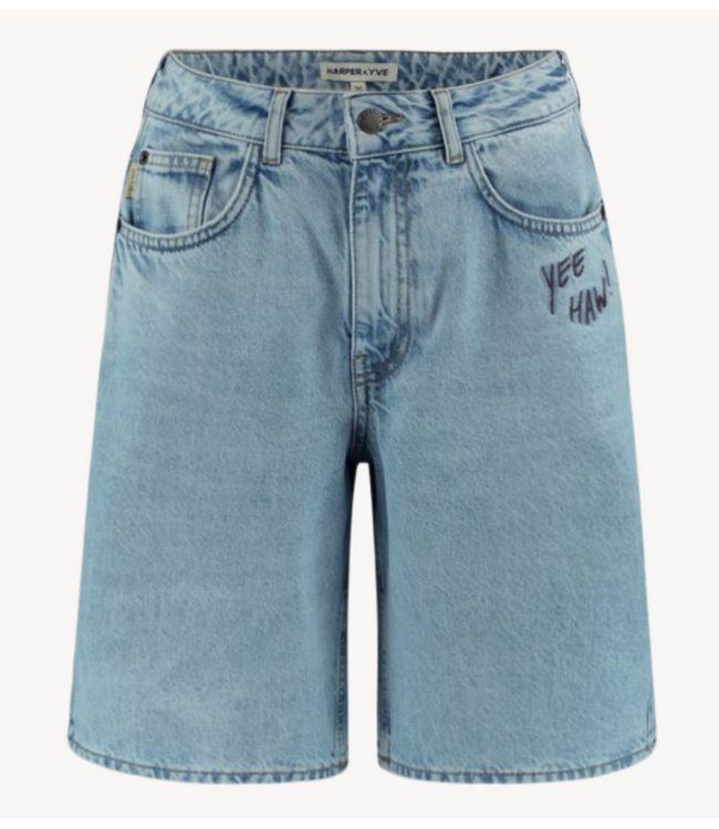 Korte jeans tot net boven de knie van het merk Harper & yve. De jeans heeft op de voorzijde een geborduurde opdruk met de tekst 'Yee haw!'