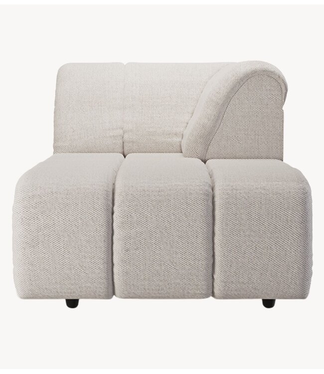 Chaise longue met rechter armleuning uit de Wave serie van het merk HKliving. De serie is geïnspireerd op het Hollywood van de begin jaren zeventig en kenmerkt zich door zijn uitgesproken vorm met afgeronde hoeken. Dit element is gestoffeerd met een beige stof en is speciaal ontworpen voor de Wave bank.