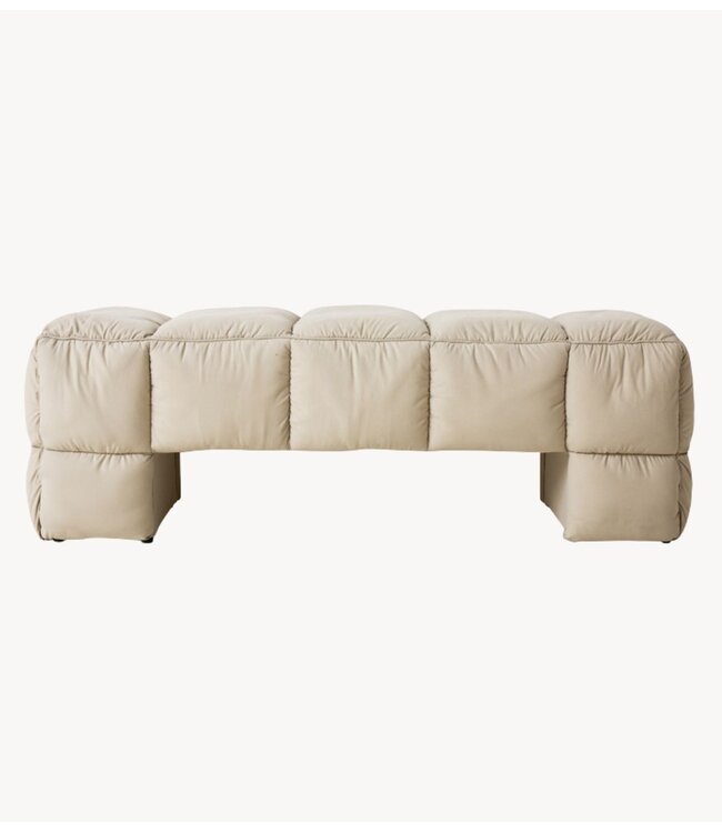 Deze zachte lobbybank heeft een speels silhouet en gestikte stof die zowel comfort als karakter toevoegt. Het zachte volume geeft elke kamer een vriendelijke uitstraling