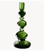 Deze smaragdgroene glazen kaarsenhouder, opgebouwd uit gestapelde, edelsteenachtige vormen, speelt op een bijna bedrieglijke manier met gewicht en licht. Solide en geruststellend in de hand, maar visueel licht, vangt hij zowel daglicht als kaarslicht op en verspreidt reflecties door de kamer. Het sculpturale silhouet transformeert een simpele vlam in een klein focuspunt – ingetogen overdag, stralend zodra de vlam brandt.