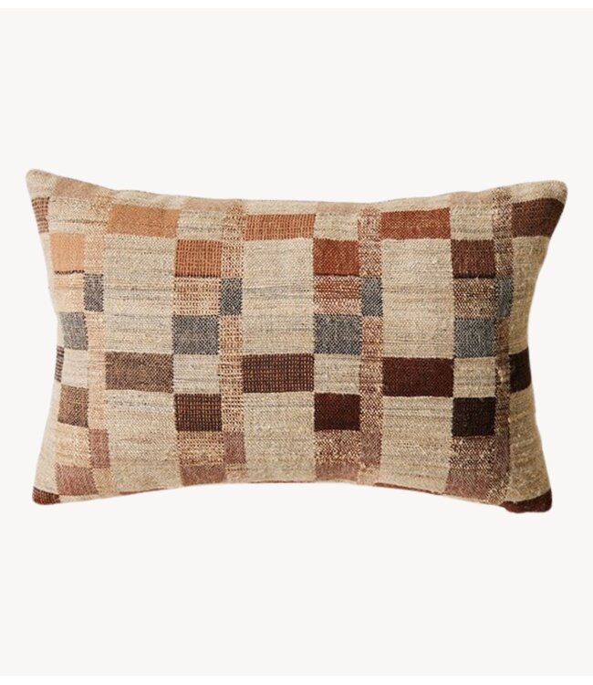 Rechthoekig kussen van het merk HKliving. Het kussen wordt geleverd inclusief binnenkussen, heeft aan zowel de voor- als achterkant een geblokt patroon en is gemaakt van een zijde / wol mix.