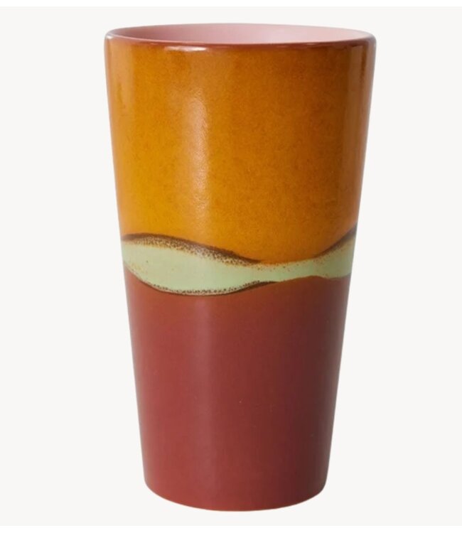 Latte mok uit de 70's serie van het merk HKliving. De mok heeft een verloop van verschillende kleuren; oranje, groen, roze, met een eenkleurige binnenkant. Door de afwerking is elke mok uniek en zijn er diverse nuances zichtbaar.