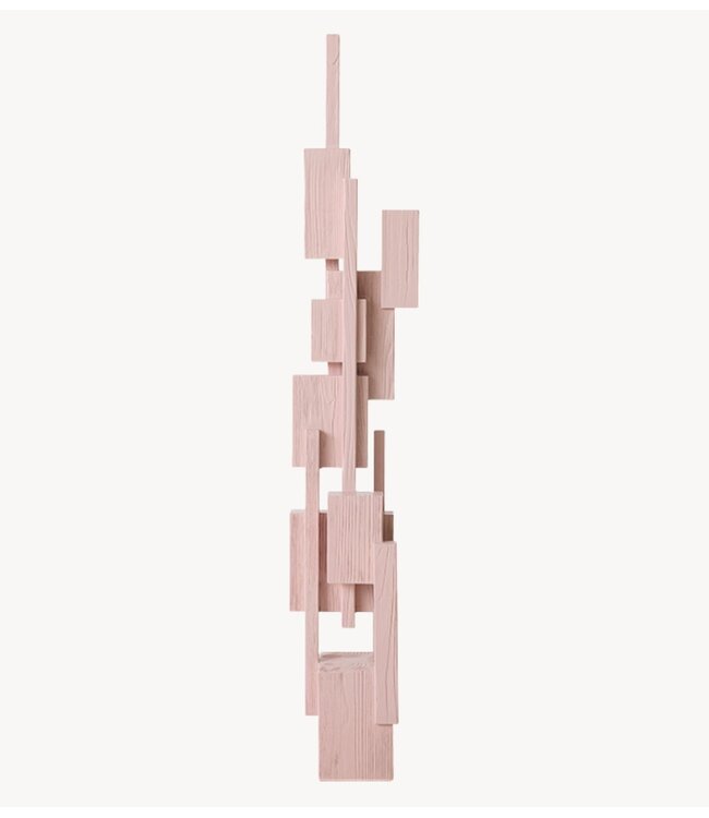 De sculptuur Skyscraper speelt met herhaling en proportie en creëert een silhouet geïnspireerd op een skyline, geworteld in de brutalistische architectuur van de jaren 60. Gemaakt van gelaagde blokken gerecycled hout en afgewerkt in een zachtroze tint, balanceert het ruwe materiaal met grafische kleuren. Een gedurfde maar beheerste aanwezigheid die structuur aan de ruimte geeft.