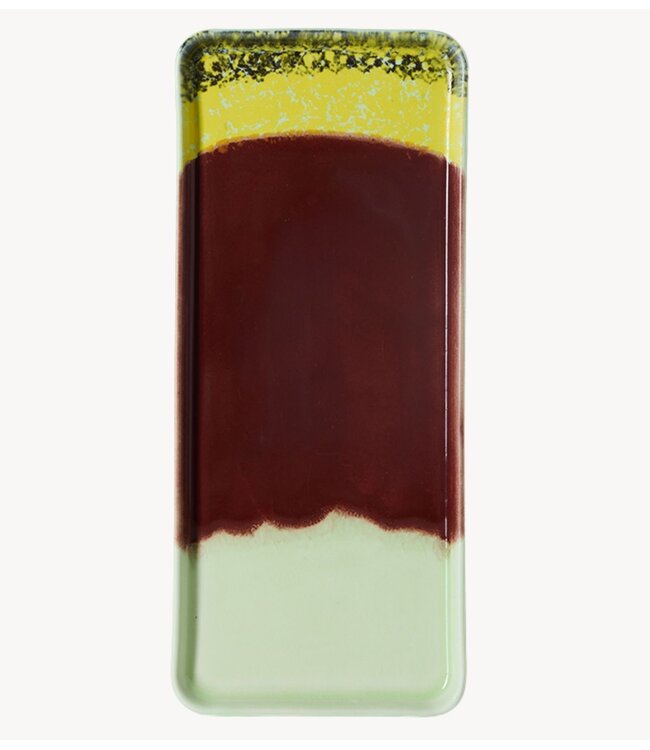 Deze rechthoekige taartonderzetter combineert opvallende kleurcontrasten in een rijk, gelaagd glazuur. Diepe kersentinten ontmoeten zachte, doorschijnende nuances, waardoor een grafisch maar organisch oppervlak ontstaat. Ideaal voor het serveren van taart, gebak of kleine hapjes, en tevens een opvallende blikvanger op tafel.