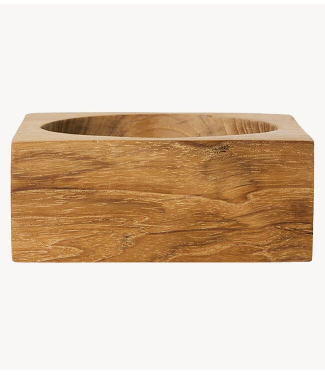 De kleine teakhouten kubus is uit massief teakhout gesneden, waar scherpe geometrie samensmelt met een zachte, verzonken holte. De warme houtnerf voegt tactiliteit en diepte toe, waardoor de vertrouwde kubusvorm een rustigere, meer geaarde uitstraling krijgt. Gebruik hem om kleine voorwerpen in op te bergen, of laat hem op zichzelf als sculpturaal accent dienen.