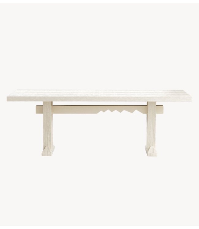 Gedefinieerd door geometrie en materiaal. Deze rechthoekige eettafel is voorzien van de kenmerkende dwarsbalk die de grafische taal van de Forma-collectie weerspiegelt. Afgewerkt in een zachte parelmoertint, accentueert de tafel de natuurlijke houtnerf eronder – een combinatie van warmte en verfijning. Een evenwichtig ontwerp dat architectonisch en tegelijkertijd uitnodigend aanvoelt.