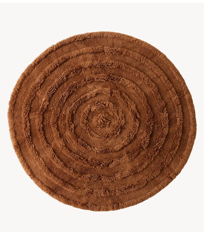 Rond vloerkleed in een bruine kleur van het merk HKliving. Het vloerkleed is laagpolig geknoopt, heeft een hoogpolige rand en is verkrijgbaar in vijf verschillende kleuren.