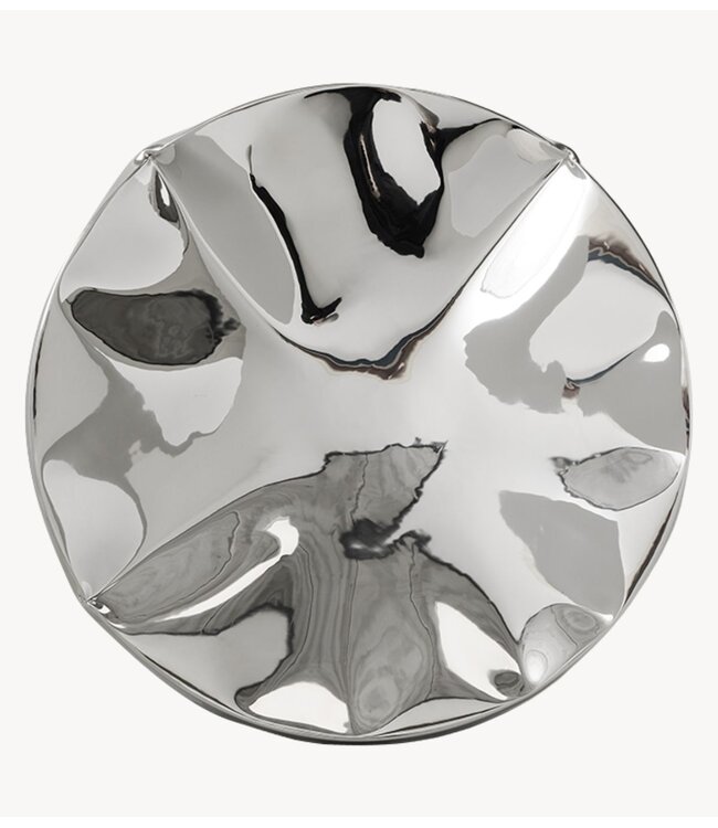 Dent is een wandsculptuur met een verchroomd oppervlak dat de reflectie ervan vervormt en verstoort. De opzettelijk ingedeukte vorm doorbreekt de spiegelende afwerking en transformeert de reflectie in iets abstracts en onvoorspelbaars. In plaats van helderheid te bieden, creëert het visuele spanning – waardoor de blik steeds weer terugkeert. Een gedurfd, sculpturaal statement dat de muur transformeert tot een beleving.