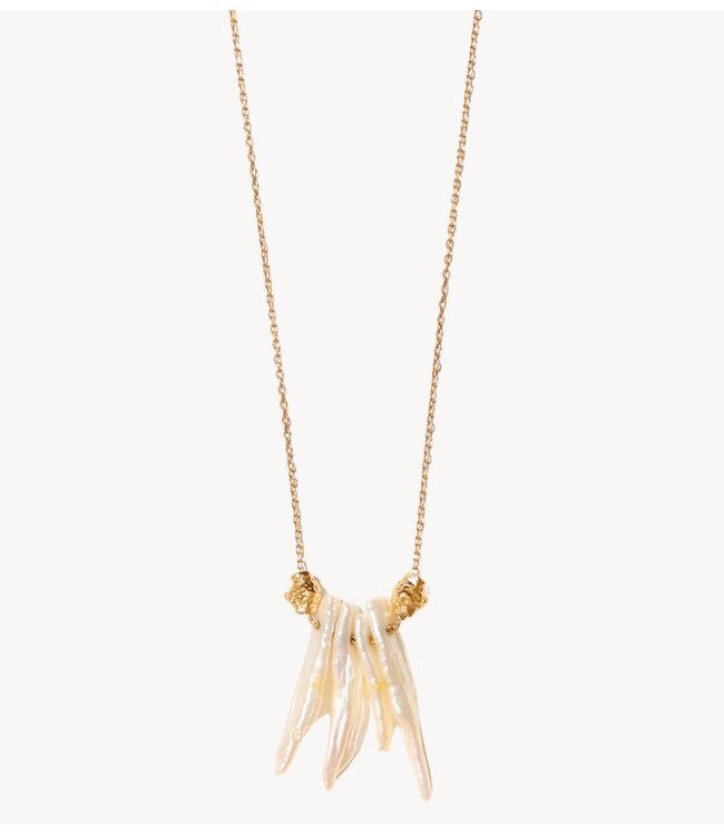 Zoet, eenvoudig en vol charme. De Pearl Drops ketting is voorzien van speelse druppels van echte barokparels, die dansen langs een delicate gouden ketting. Elk stuk is met liefde handgemaakt en voegt een vleugje speelsheid en elegantie toe aan elke outfit.