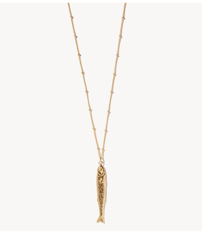 Verguld visvormig hangertje. Een vis symboliseert harmonie, overvloed, geluk, vernieuwing, liefde en de balans tussen verstand en gevoel. Leuk om alleen te dragen of perfect als onderdeel van een andere hanger.