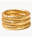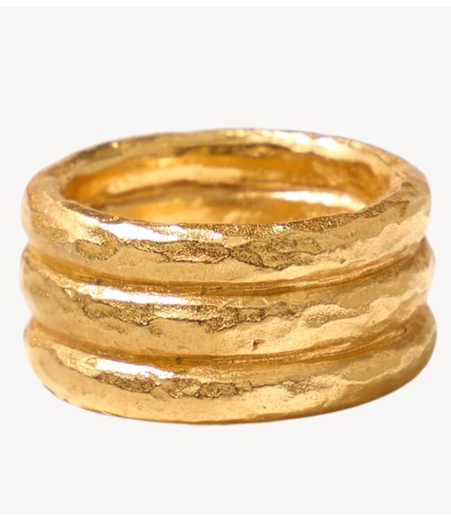 Drie ringen in één: een stijlvolle combinatie van speelsheid en harmonie. Deze gehamerde ring heeft een geweven structuur die bij elke beweging licht en dynamiek weerkaatst – een eerbetoon aan individualiteit en vrouwelijke kracht.