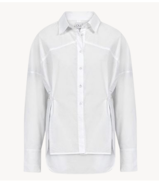 Witte blouse met een klassieke kraag en grote manchetten. De mouw is voorzien van een geborduurd OU. logo. De blouse heeft een knoopsluiting op de voorzijde en heeft een comfortabele, licht oversized pasvorm. De blouse is in de taille verstelbaar door een extra knoopje.
