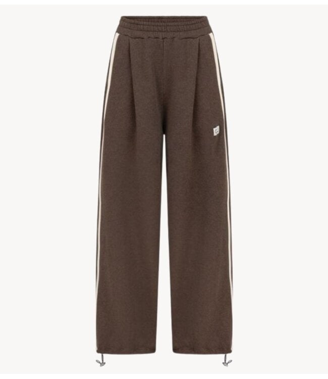 Onze Pants du Quartier Mocha is gemaakt van een soepel vallende stof. Het heeft een high rise, wide fit met rechte pijpen en een elastische tailleband. Langs beide zijnaden lopen contrasterende strepen die de broek een sportief accent geven. De onderkant heeft een verstelbaar detail hiermee kunnen de broekspijpen worden versmalt