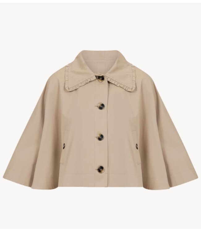 Cape van het merk OU.Boutique. De Cape Orsay Beige heeft een klassieke kraag, afgewerkt met subtiele ruches die zorgen voor een verfijnde uitstraling. De ruime/ wijd uitlopende pasvorm maken het een veelzijdig item dat comfortabel over verschillende outfits gedragen kan worden.