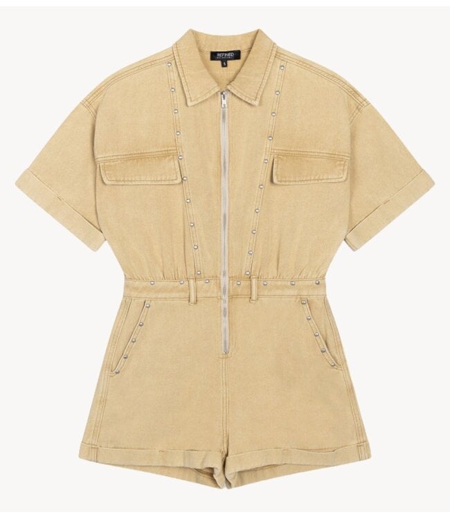 Geweven damesjumpsuit met relaxte pasvorm en subtiele studs voor een stoere, stijlvolle uitstraling.