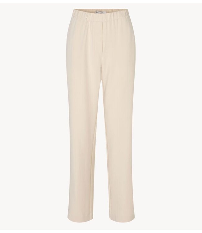 Crèmekleurige broek van het merk Samøe Samsøe. Deze pantalon heeft een relaxed fit, rechte pijpen, valse gulp, omgeslagen zomen en elastische taille. De broek is afgewerkt met zakken in de zijnaad.