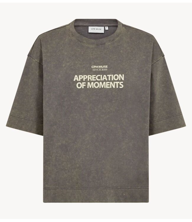 CMMUSE-TEE is een comfortabel T-shirt met korte mouwen, gemaakt van zware, zachte katoenen jersey met een opvallende acid-washed afwerking. Het gewassen oppervlak zorgt voor diepte en een subtiel vintage karakter, terwijl de gecentreerde print "APPRECIATION OF MOMENTS" op de voorkant een krachtig grafisch statement toevoegt.