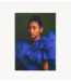 Fotografisch portret Volt met opvallend blauw tuleontwerp tegen een rijke groene achtergrond. Afgewerkt op plexiglas, een strak en modern kunstobject vol aanwezigheid.