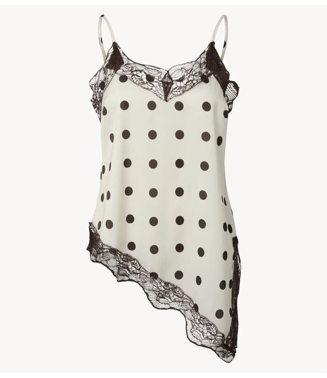 De vloeiende stof valt soepel langs het lichaam en creëert een elegante, vrouwelijke look, terwijl de fijne bandjes en asymmetrische zoom zorgen voor een moderne, speelse twist. De lace afwerking geeft de top een luxe feel — perfect voor zowel daytime layering als avondlooks.