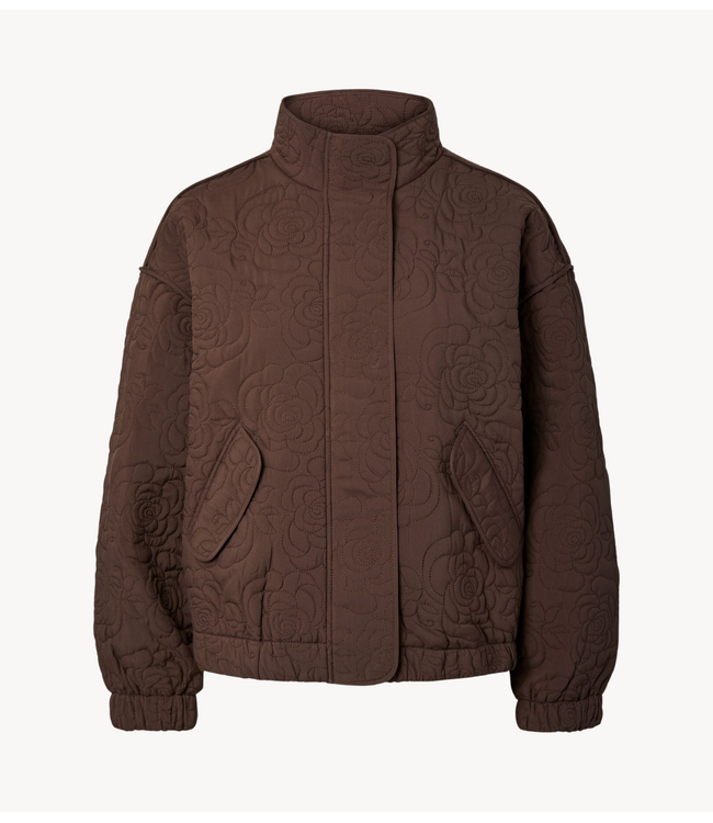 Y.A.S jacket. Dit chocolate brown jack heeft zijzakken met drukknopen en een ritsluiting met drukknopen aan de voorzijde. Het heeft een hoge hals met lange mouwen en de manchetten zijn elastisch.